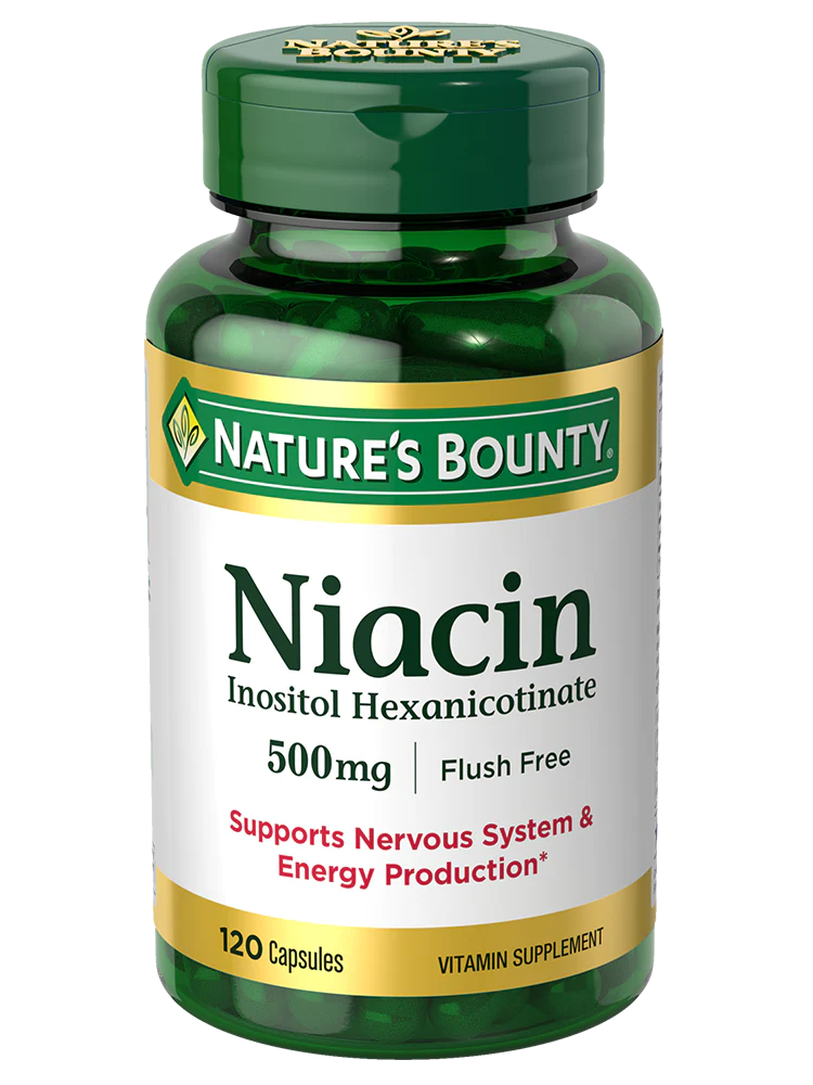 Niacin, also known as Vitamin B-3, is found in foods such as beef, chicken, tuna, peanuts, avocados and potatoes. Niacin as Inositol Hexanicotinate is also known as Flush Free Niacin, which means that you don't experience an uncomfortable flush when taking this product.** Niacin supports energy metabolism and nervous system health.*