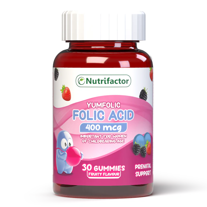 - Nutrifactor’s Yumfolic includes Folic Acid, with each gummy delivering 400 mcg, the exact dose recommended by the NHS. Folic acid, also known as Vitamin B9, is a water-soluble B-vitamin essential for supporting overall well-being in women. It helps boost energy levels, supports healthy cognitive function, balances hormones, and promotes overall reproductive health.